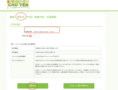 2)次の画面が表示されます:各箇所をご確認ください。問題ないようなら、予約の緑ボタンをクリックします。