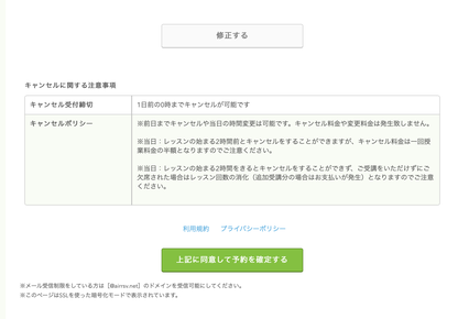 4)情報を確認し、間違いなければ「上記に同意して予約を確定する」ボタンを押す、修正したい場合は 「修正する」ボタンをクリックします。