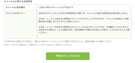 予約のキャンセルは【予約内容照会画面】のリンクからもご利用頂けます。前日までのキャンセルは可能です(キャンセル料金0円)。※当日のキャンセルや時間変更は電話かEメールにて教室にご連絡ください。※レッスンの始まる2時間前とキャンセルをすることができますが、キャンセル料金は一回授業料金の半額となりますのでご注意ください。レッスンの始まる2時間をきるとキャンセルをすることができず、ご受講をいただけずにご欠席された場合はレッスン回数の消化(追加受講分の場合はお支払いが発生)となりますのでご注意ください。