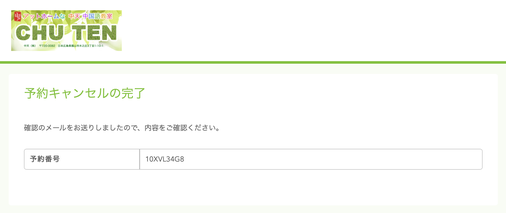 予約キャンセルの完了ページが出ます。同じくお客様の登録したメールアドレス宛てにキャンセルメールが自動発信されます。ご確認ください。