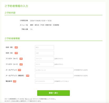 3)予約者の情報を入力ください。「確認へ進む」の緑ボタンをクリックします。